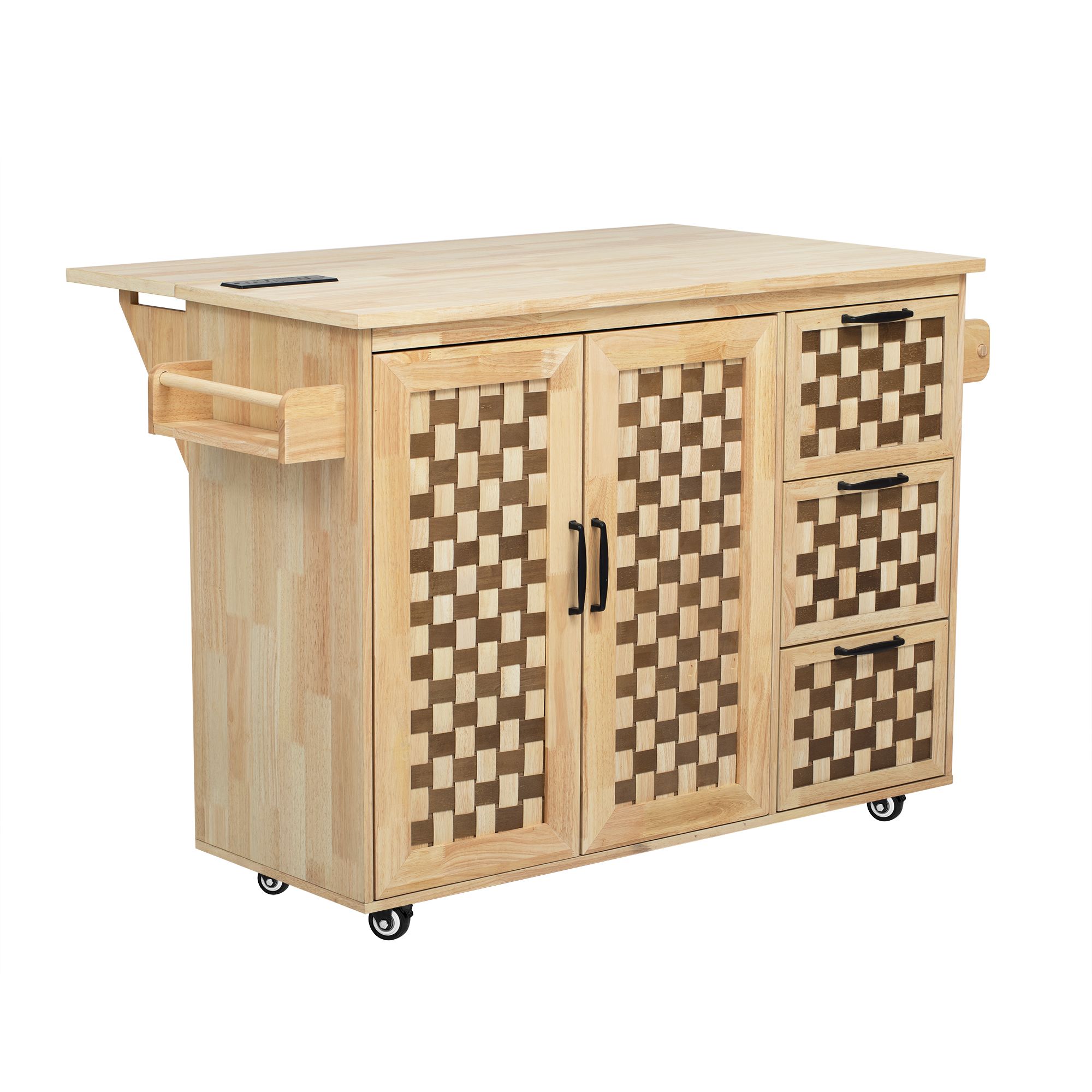 Our vintage style kitchen island boasts a beautiful woven checkerboard look design. The unique natural wood color look pairs well with the two-tone woven dimensional checkerboard grid surface. Every part of this kitchen cart is crafted with care.